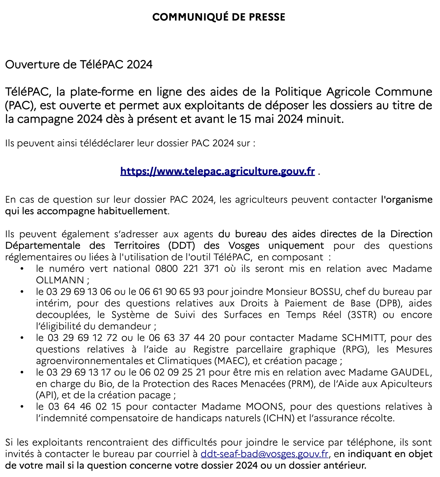 TéléPAC, la plate-forme en ligne des aides de la Politique Agricole Commune (PAC), est ouverte et permet aux exploitants de déposer les dossiers au titre de la campagne 2024 dès à présent et avant le 15 mai 2024 minuit.