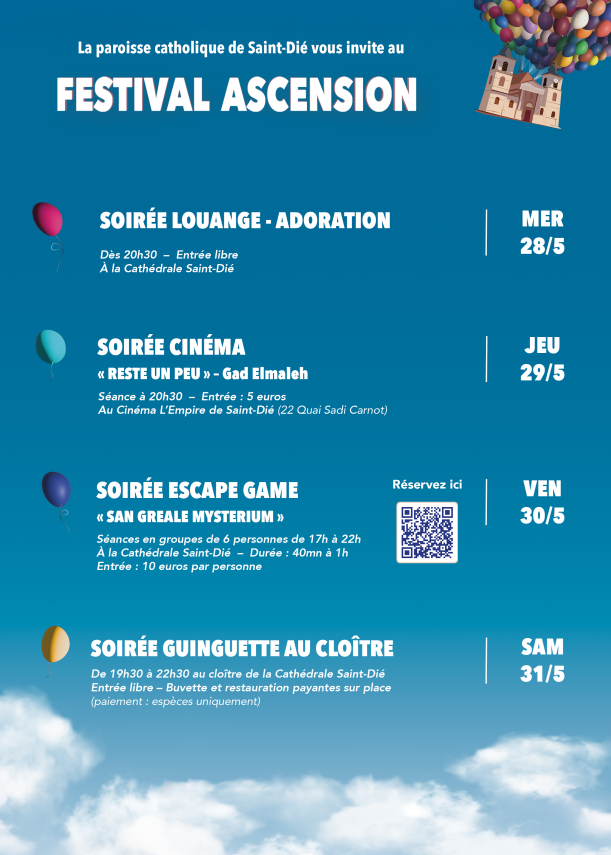 La paroisse catholique de Saint-Dié-des-Vosges invite toute la population à vivre une semaine placée sous le signe de la rencontre, de la foi et de la convivialité à l’occasion du Festival Ascension, du 28 au 31 mai.