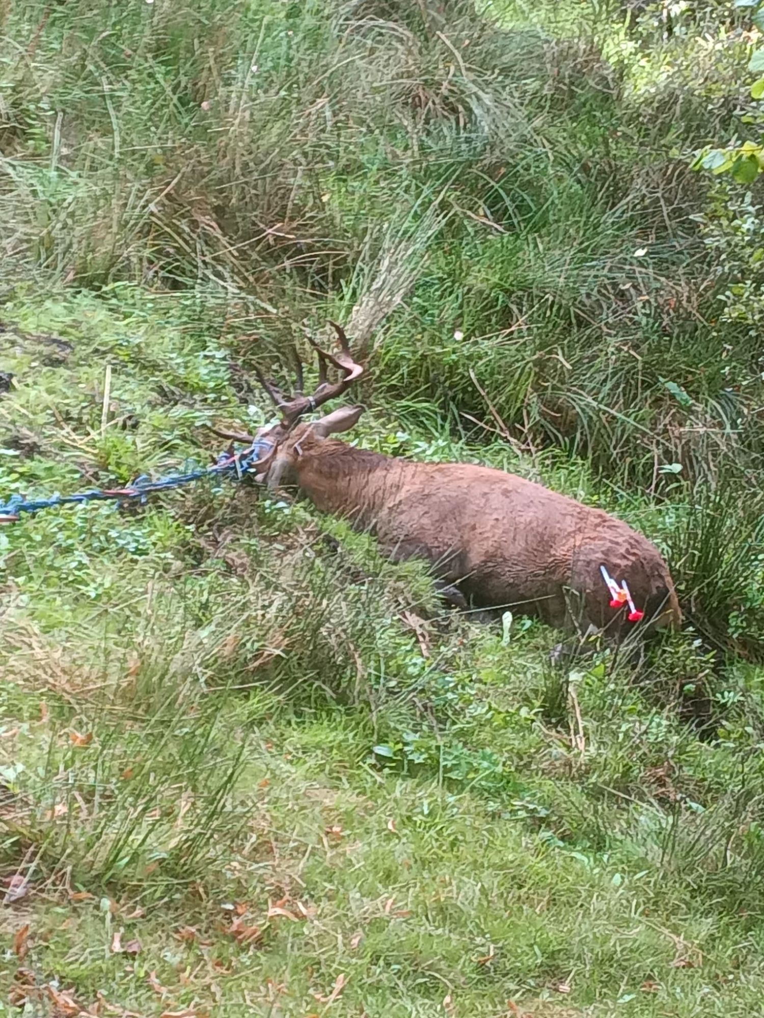 Une fois dégagé, le cerf, un superbe spécimen à 12 andouillers, a été marqué d’une large trace rouge. Ce procédé permet de signaler aux chasseurs que l’animal ne doit pas être abattu, car les produits utilisés pour son endormissement rendent sa viande impropre à la consommation.