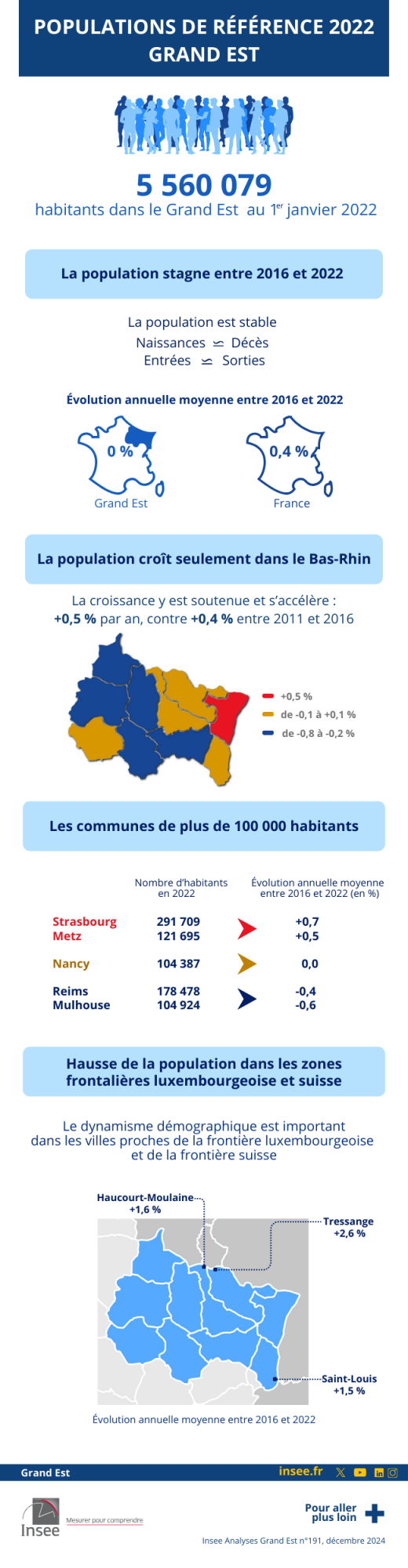 Au 1er janvier 2022, près de 5,6 millions de personnes résident dans le Grand Est. Depuis 2011, la population de la région est stable.