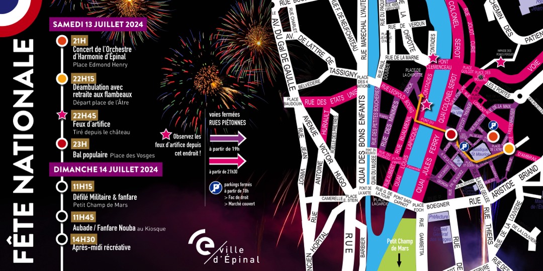 Comme les années précédentes, Épinal célébrera la fête nationale sur deux jours, ce samedi 13 et ce dimanche 14 juillet. Au programme : des animations festives samedi soir dans le centre-ville, puis le lendemain matin le traditionnel défilé militaire et l’hommage rendu aux forces de sécurité, avant un après-midi récréatif au parc du Château.