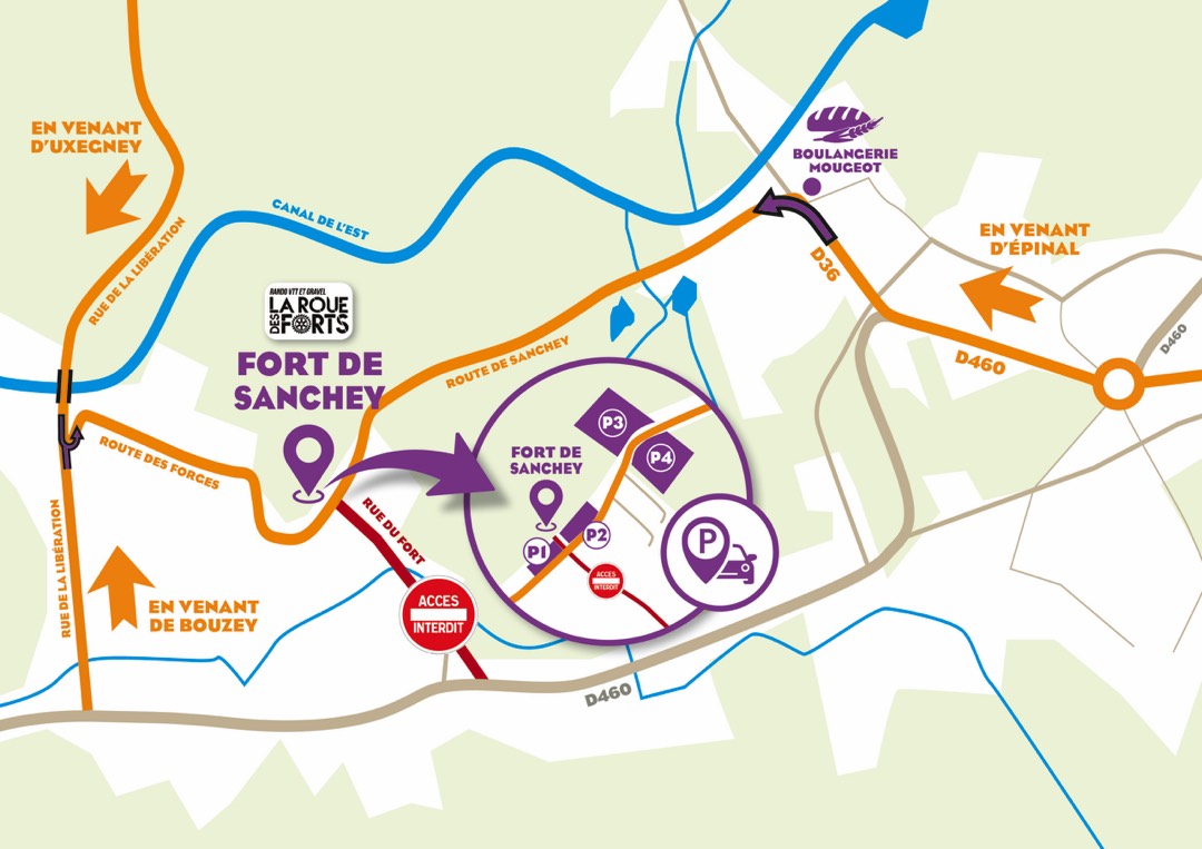 Depuis Épinal : direction Les Forges, face à la boulangerie Mougeot, direction Fort de Sanchey.