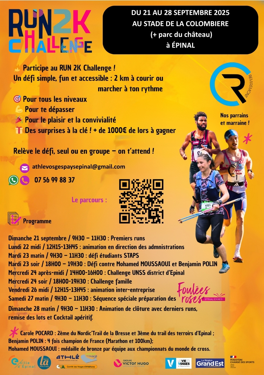 Participez au Run 2K Challenge à Épinal du 21 au 28 septembre 2025 : un défi simple, fun et accessible, 2 km à courir ou marcher à son rythme.