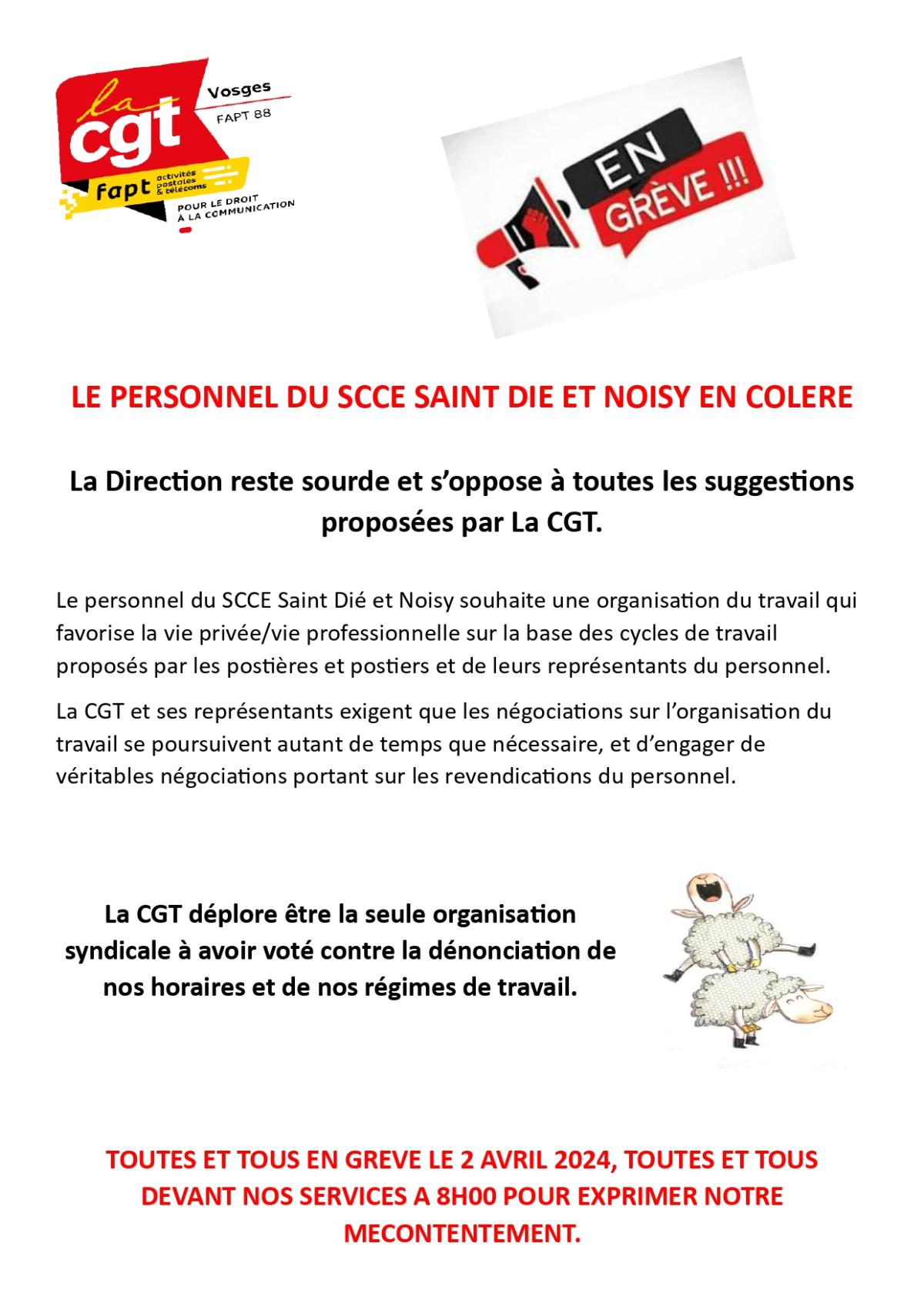 Suite à une annonce de modifications des horaires et de cycle de travail . le syndicat FAPT CGT (Fédération des salariés du secteur des activités postales et de télécommunications) a déposé un préavis de grève pour le mardi 2 avril 2024 concernant notamment le site de Saint-Dié-des-Vosges.