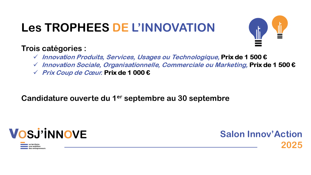 Candidatures 1er–30 septembre pour les Trophées de l’Innovation. Remise le 18 novembre au Salon Innov’Action à Épinal. Dotations et jury local.