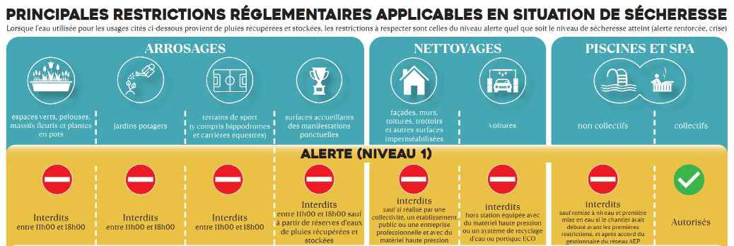 Les mesures de limitation concernent l’arrosage, le remplissage des piscines, le lavage des véhicules ou encore l’irrigation agricole. Les contrevenants s’exposent à des amendes pouvant atteindre 1 500 euros (et 3 000 euros en cas de récidive).