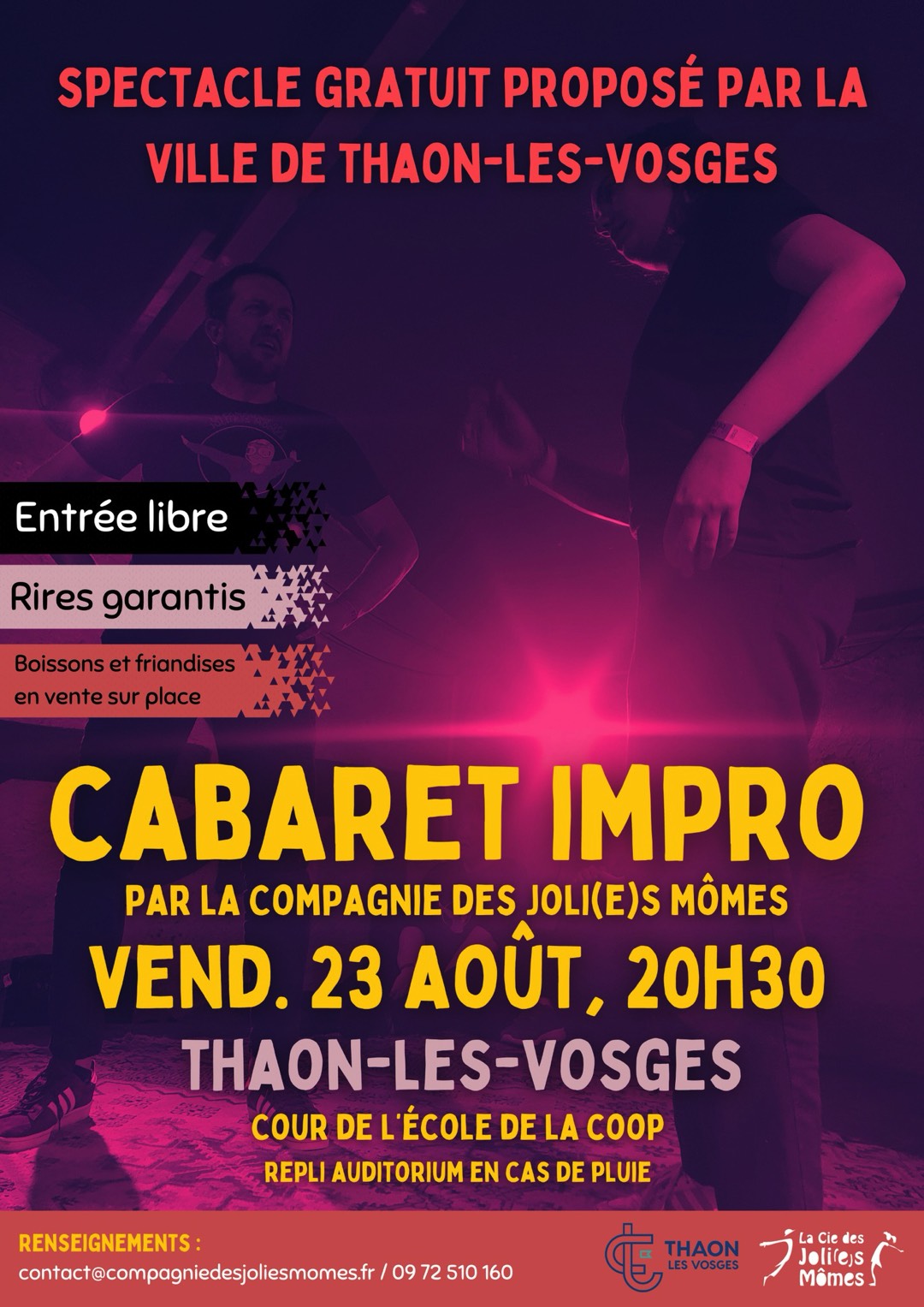 Dans le cadre de sa saison estivale, la Ville de Thaon-les-Vosges propose vendredi 23 août prochain à 20h30 un spectacle gratuit dans la cour de la COOP place Jules Ferry. Cette représentation en plein air intitulée Cabaret Impro est présentée par la Compagnie des Joli(e)s Mômes. Un spectacle joyeux, une comédie destinée à faire fonctionner les zygomatiques. Sept artistes se succéderont sur scène et le public sera invité à interagir avec les comédiens ! Du théâtre d’improvisation en direct qui réserveront de belles surprises à un public de tout âge à partir de 10 ans.