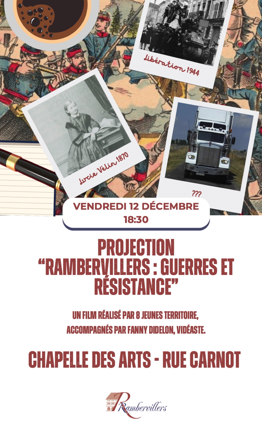 La Chapelle des Arts accueille le 12 décembre à 18 h 30 la projection du film documentaire « Rambervillers, guerres et résistance ». Ce projet s’inscrit dans l’opération C’est mon Patrimoine menée par la ville de Rambervillers avec l’AFTR, le musée de la Terre, la Mission Locale, le Préfet de la Région Grand Est et le soutien de la DRAC Grand Est.