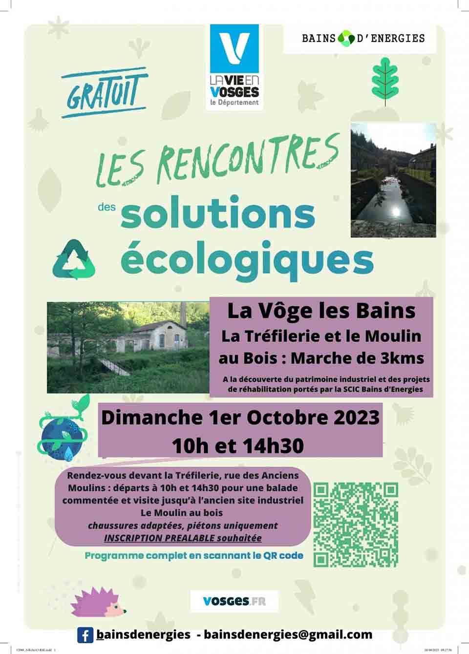 Dans le cadre des Rencontres des solutions écologiques portées par le Conseil départemental des Vosges, la SCIC (Société Coopérative d'Intérêt Collectif) Bains d'énergies propose ce dimanche 1er octobre une randonnée de 3 kms sur le site de la tréfilerie et du Moulin-aux-bois (lieu de tournage du film Indigènes en 2007) à La Vôge-les-Bains. L'occasion de partir à la découverte d'un riche patrimoine industriel et naturel, à 2 pas de la Manufacture royale.
