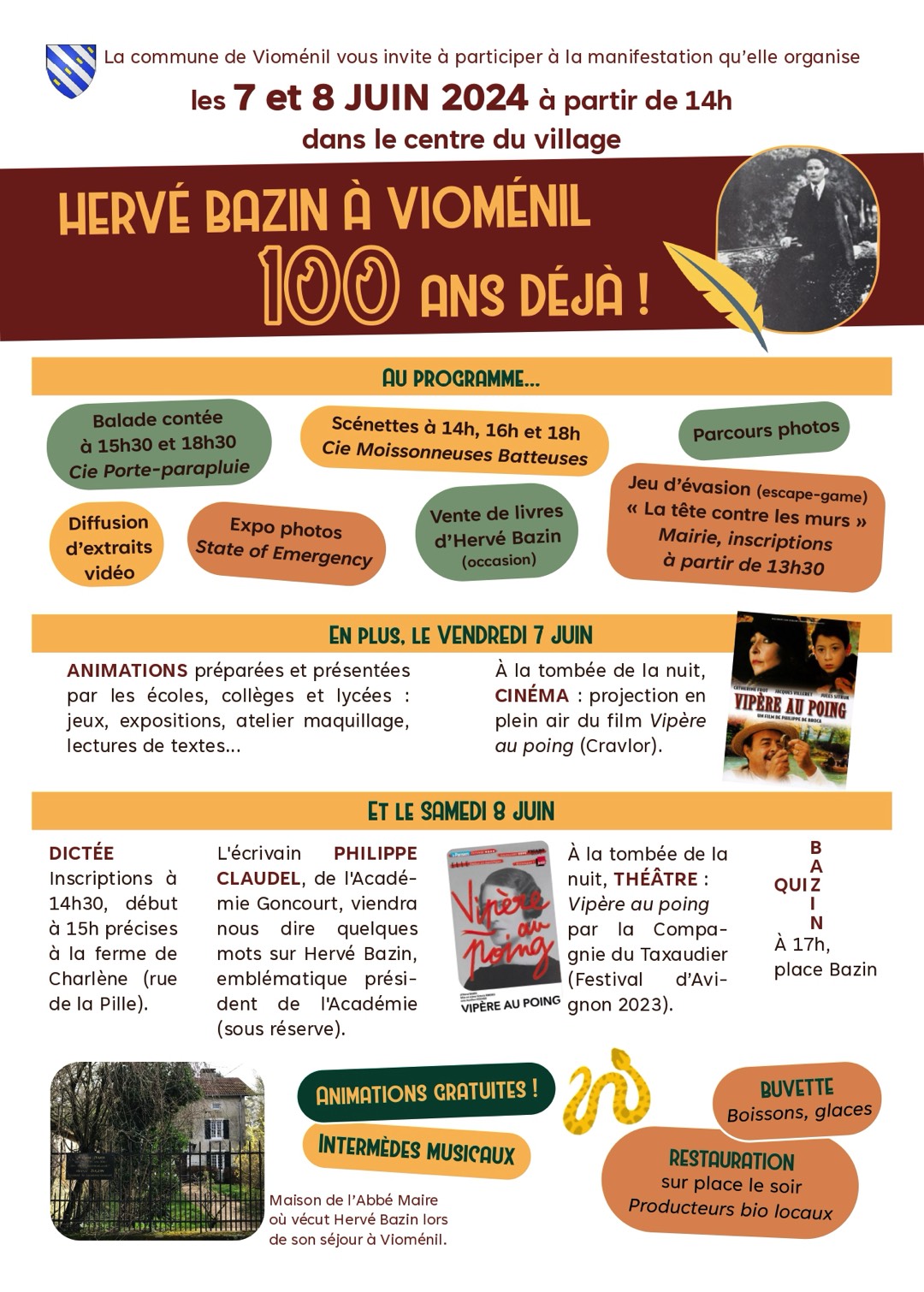 Le village de Vioménil entend célébrer le centenaire du séjour dans ses murs du célèbre écrivain Hervé Bazin (Angers, 1911- Angers, 1996), en organisant une manifestation culturelle les 7 et 8 juin.