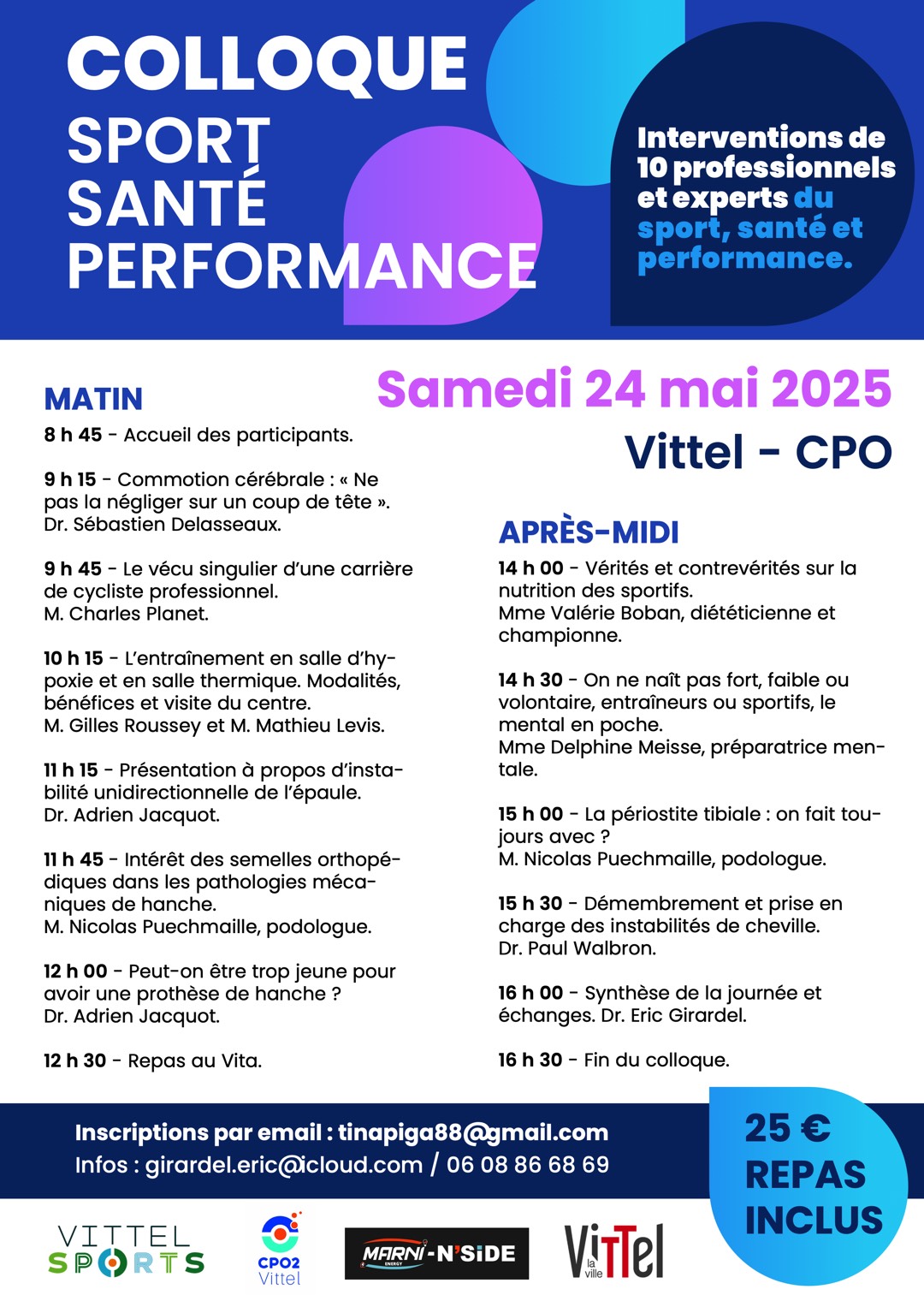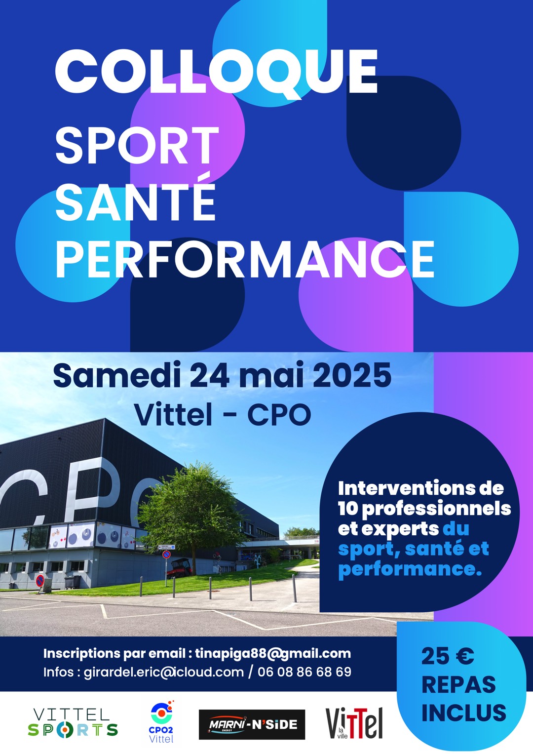 Colloque “Sport, Santé, Performance” à Vittel le 24 mai : conférences, visites du CPO2, experts santé et sport réunis pour tous.