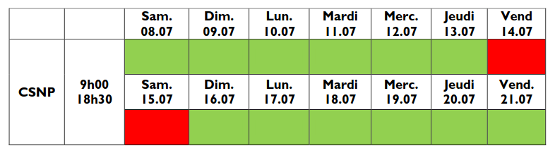 Pour la période du 8 au 21 juillet inclus, le CNSP sera ouvert tous les jours de 9h à 18h30 excepté le vendredi 14 - cela était déjà prévu - et le samedi 15.