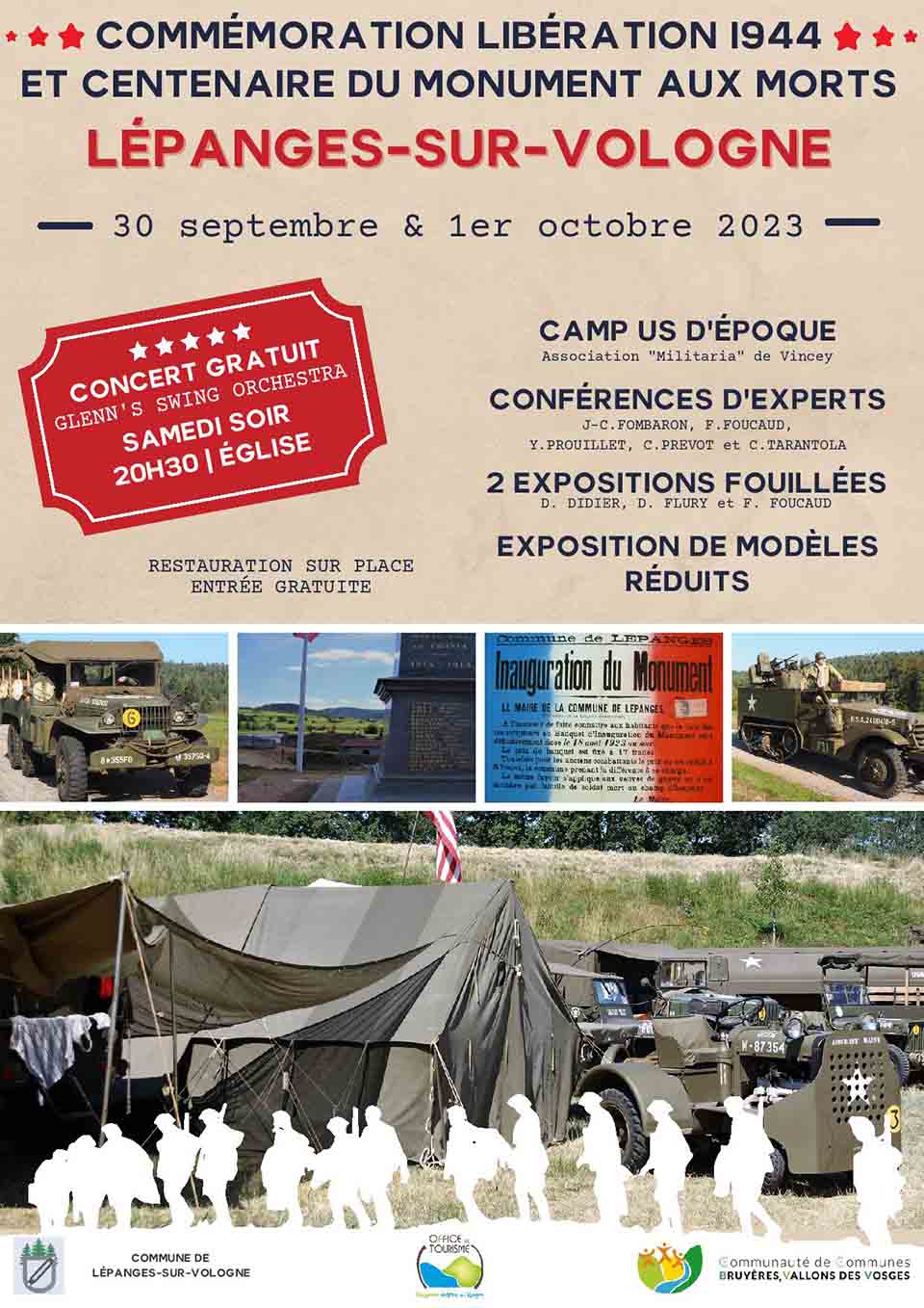 A cette occasion, le public pourra assister à des expositions et des conférences. Un camp US s'installera sur le stade municipal. Un concert Jazz Swing aura lieu le samedi soir à l'église de Lépanges sur Vologne. La cérémonie du 1er octobre sera animée par la fanfare de Bruyères et un cortège de véhicules militaires guidera le public jusqu'au vin d'honneur.