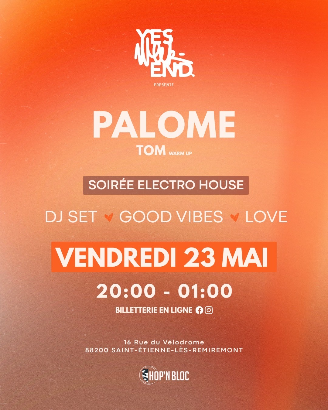 Les amateurs de musique électro house ont rendez-vous vendredi 23 mai à Hop’n Bloc pour une soirée exceptionnelle placée sous le signe de la fête et de la bonne humeur. Organisée par le collectif Yes Week-End, l’événement mettra en lumière la talentueuse DJ Palome, accompagnée en warm-up par Tom.