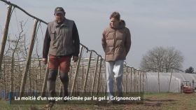 Julien Grandieu, arboriculteur à Grignoncourt, a perdu la moitié de ses cultures en l'espace de trois nuits à cause de l'épisode de gel survenu la semaine dernière. Jusqu'à 80% de certaines essences ont été endommagées par le froid. Des bougies antigel ont été installées et des tracteurs dits "Dragon de brouillard" ont tourné autour des 30 hectares de culture pour minimiser les pertes.