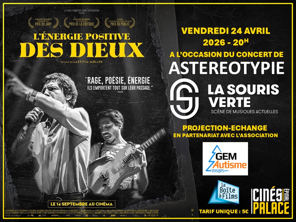 Le 24 avril, le Cinés Palace proposera la projection du film L’Énergie positive des dieux (20h). Le 25 avril, Astéréotypie sera en concert à la Souris Verte, avec Pales en première partie (Plus d'infos).