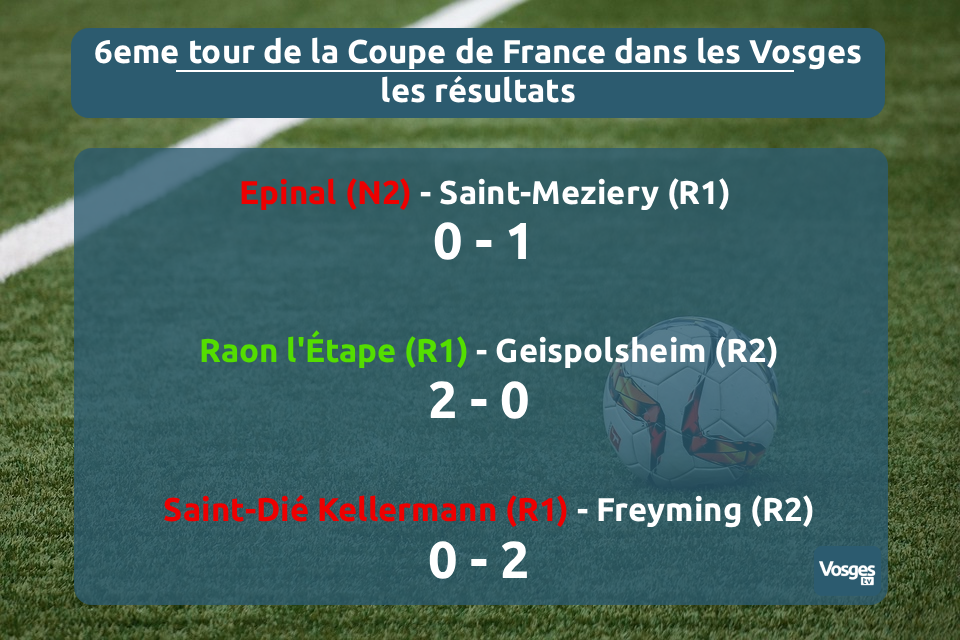 Des 3 clubs vosgiens qui jouaient pour accéder au 7ème tour de la Coupe de France de Football, seul Raon l'Étape a su tirer son épingle du jeu ce week-end : c'est fini donc pour Saint-Dié Kellermann qui se déplaçait à Freyming, et pour le SAS Épinal qui jouait en extérieur contre Saint-Meziéry...