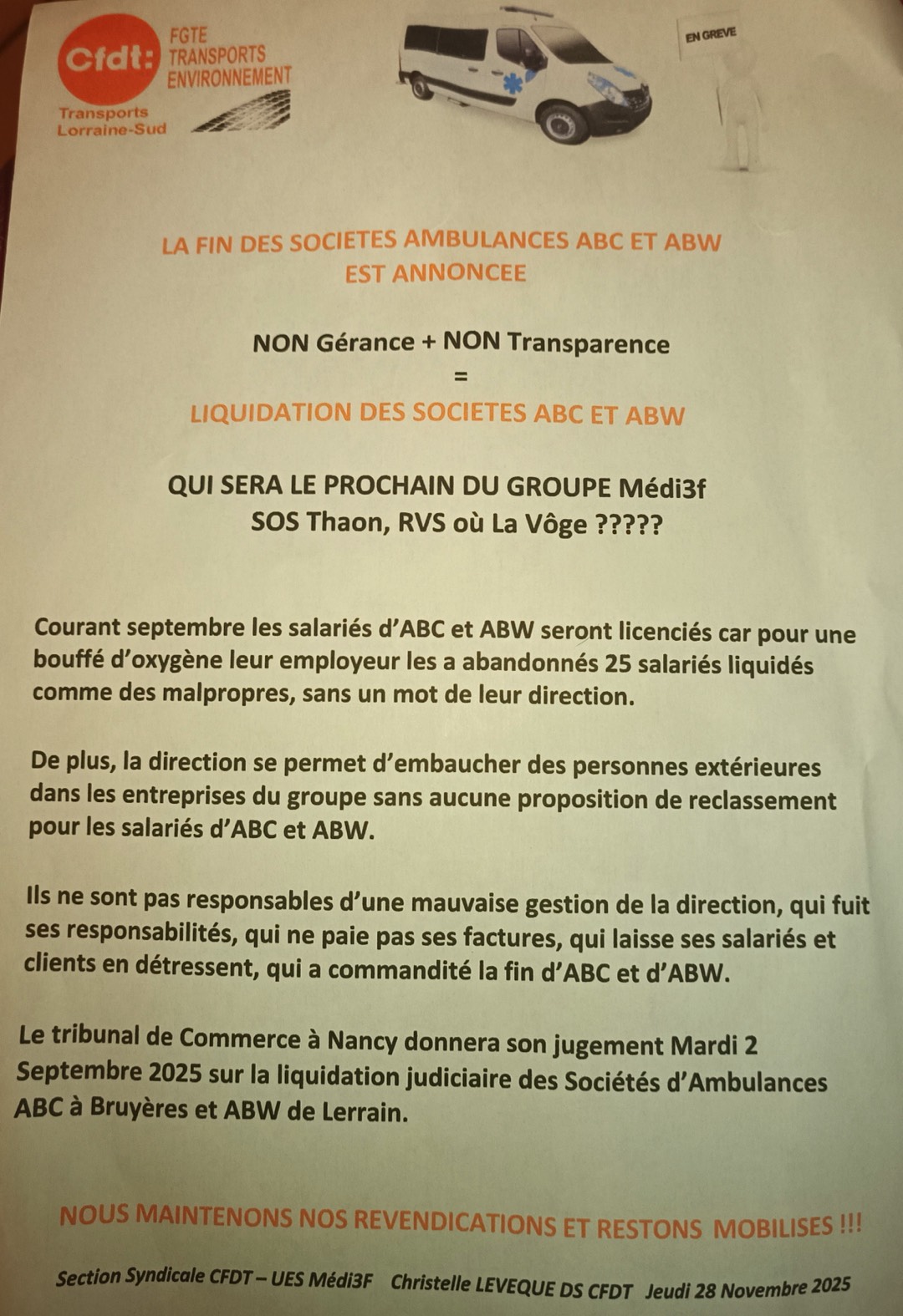 La décision concerne uniquement ABC à Bruyères et ABW à Lerrain. Les autres sociétés du groupe Médi 3F — SOS Thaon, RVS à Remiremont et Ambulances de la Vôge à Xertigny — ne sont pas concernées à ce stade.