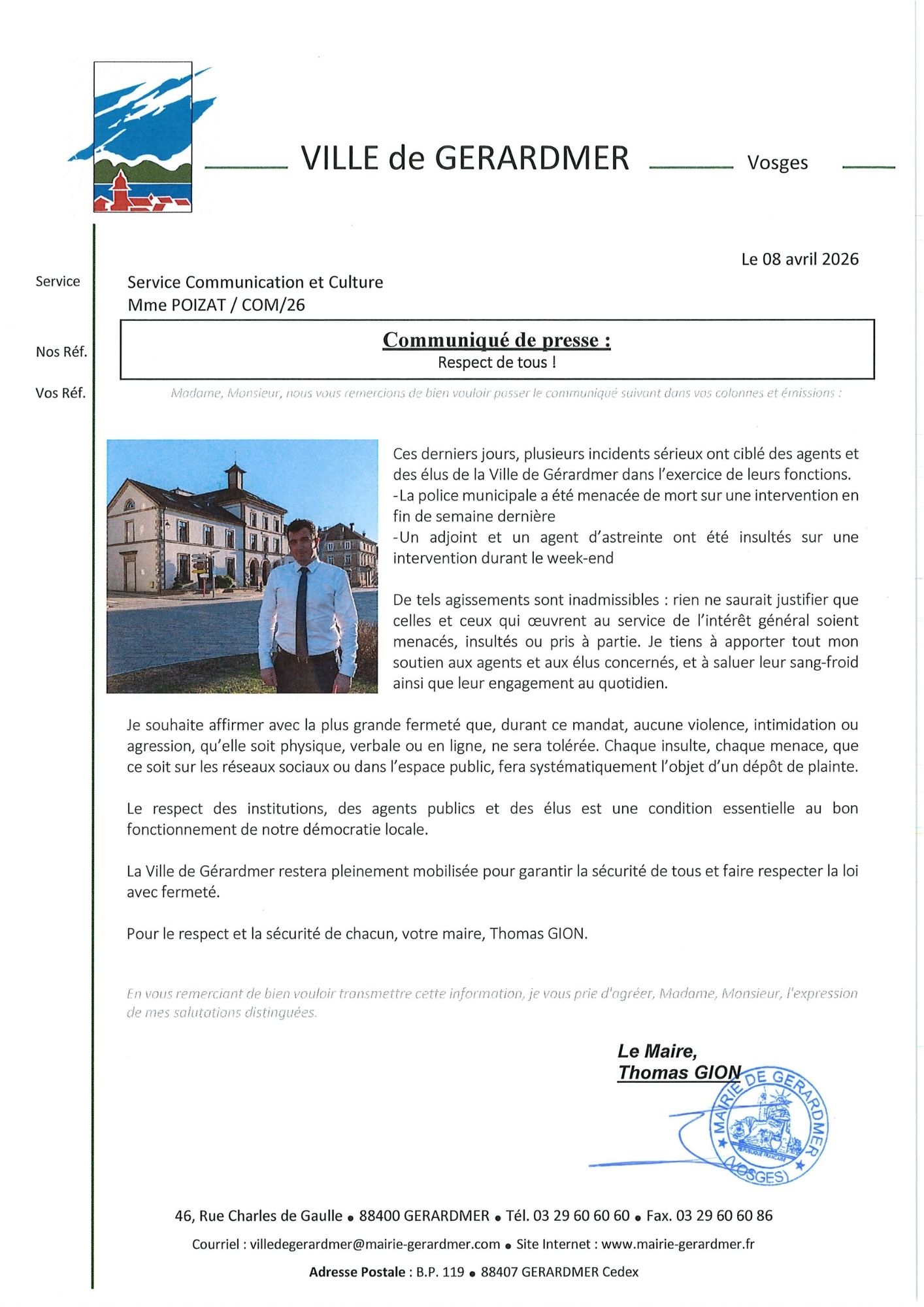 Face à ces faits, le maire de Gérardmer, Thomas Gion, exprime son soutien aux personnes concernées. « De tels agissements sont inadmissibles : rien ne saurait justifier que celles et ceux qui œuvrent au service de l’intérêt général soient menacés, insultés ou pris à partie », indique le communiqué.