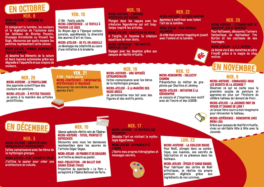 Outre les mercredis après-midi, des rendez-vous en soirée à 18 h sont proposés aux adultes, comme une conférence sur le textile ou une autre sur les sorcières dans l’art. Un temps fort autour de la danse mettra également à l’honneur Edgar Degas et proposera une projection d’un ballet de l’Opéra national de Paris.