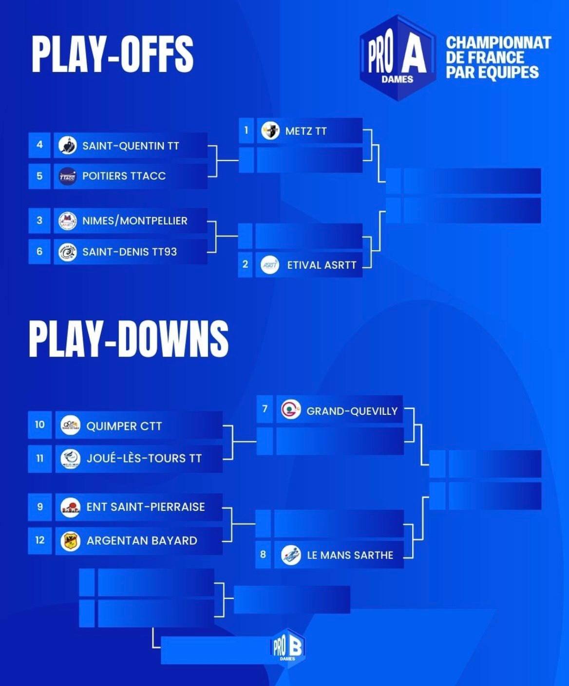 Grâce à sa victoire mardi soir à Quimper (3-1) lors de la dernière journée de Pro Dames, l'ASRTT Etival a assuré sa 2ème place, synonyme de qualification directe pour les demi-finales du championnat. Tout comme le Metz TT, solide leader de la saison régulière (10 victoires en 11 journées), les Stivaliennes attendent désormais le nom de leur futur adversaire, à savoir Nîmes/Montpellier ou Saint-Denis. Les Messines affronteront le vainqueur de la confrontation entre Saint-Quentin et Poitiers.